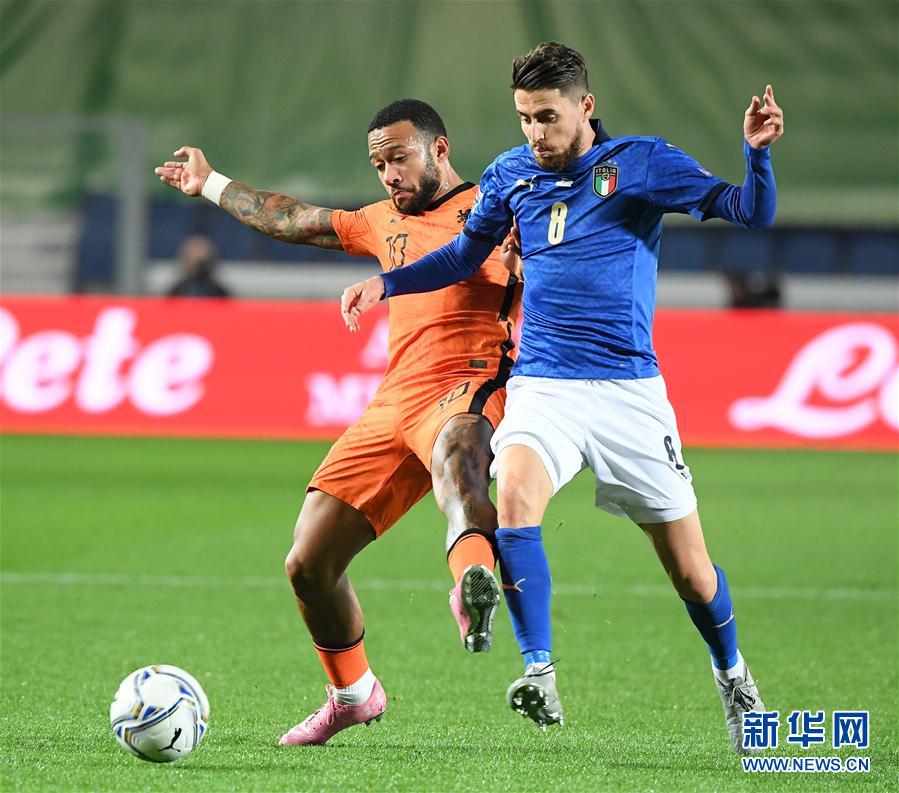 10月14日,意大利队球员若日尼奥(右)与荷兰队球员德佩拼抢。 当日,在意大利贝加莫进行的欧足联国家联赛A级第1组第四轮的比赛中,意大利队主场以1比1战平荷兰队。 新华社发(阿尔贝托·林格利亚摄)