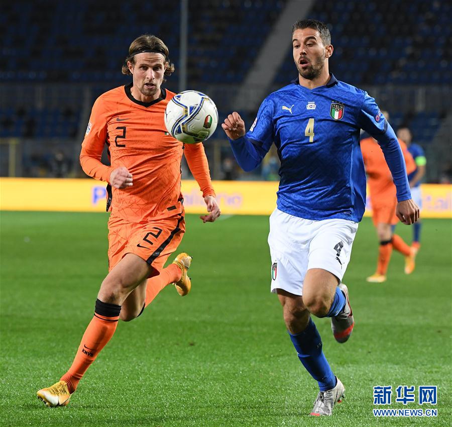 10月14日,意大利队球员斯皮纳佐拉(右)与荷兰队球员哈特鲍尔拼抢。 当日,在意大利贝加莫进行的欧足联国家联赛A级第1组第四轮的比赛中,意大利队主场以1比1战平荷兰队。 新华社发(阿尔贝托·林格利亚摄)