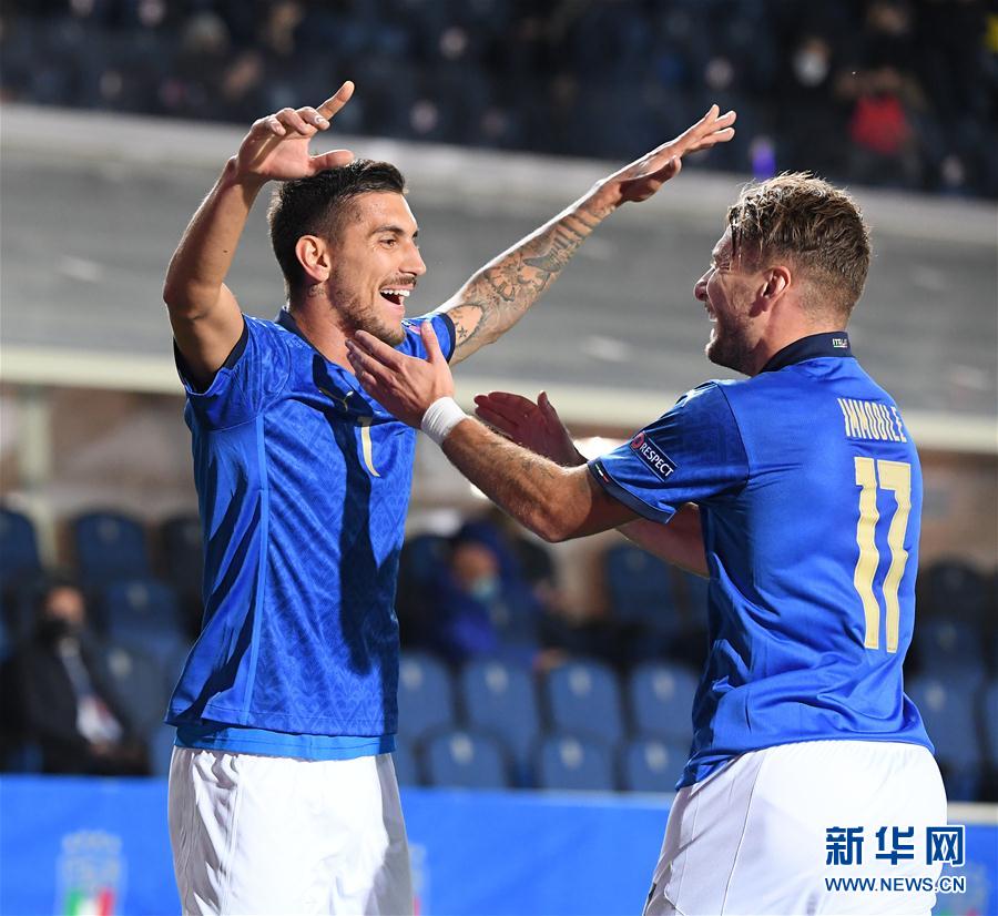 10月14日,意大利队球员佩莱格里尼(左)进球后与队友因莫比莱庆祝。 当日,在意大利贝加莫进行的欧足联国家联赛A级第1组第四轮的比赛中,意大利队主场以1比1战平荷兰队。 新华社发(阿尔贝托·林格利亚摄)