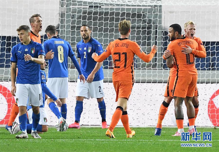 10月14日,荷兰队球员范德贝克(右一)进球后与队友德佩拥抱庆祝。 当日,在意大利贝加莫进行的欧足联国家联赛A级第1组第四轮的比赛中,意大利队主场以1比1战平荷兰队。 新华社发(阿尔贝托·林格利亚摄)