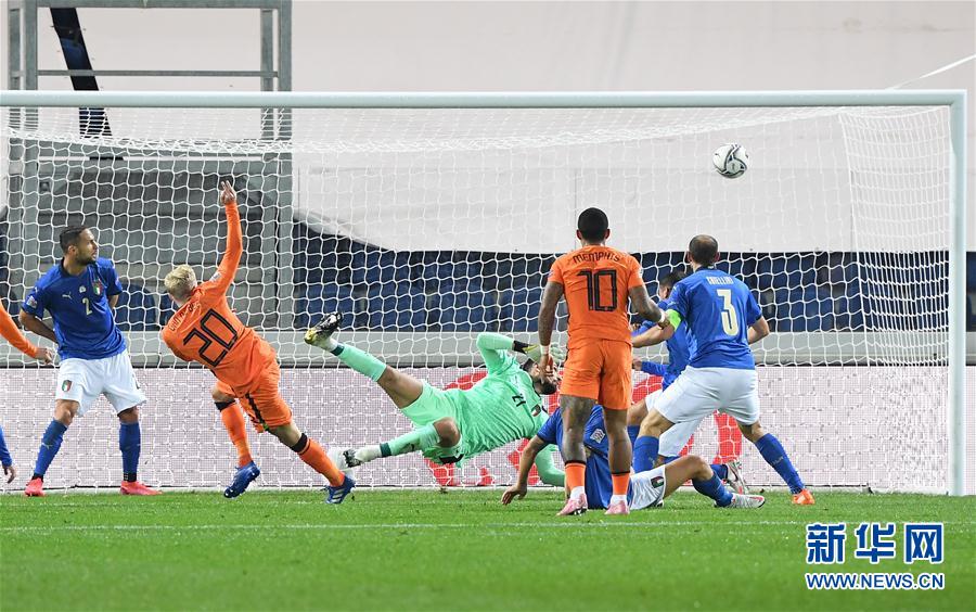 10月14日,荷兰队球员范德贝克(左二)在比赛中射门得分。 当日,在意大利贝加莫进行的欧足联国家联赛A级第1组第四轮的比赛中,意大利队主场以1比1战平荷兰队。 新华社发(阿尔贝托·林格利亚摄)