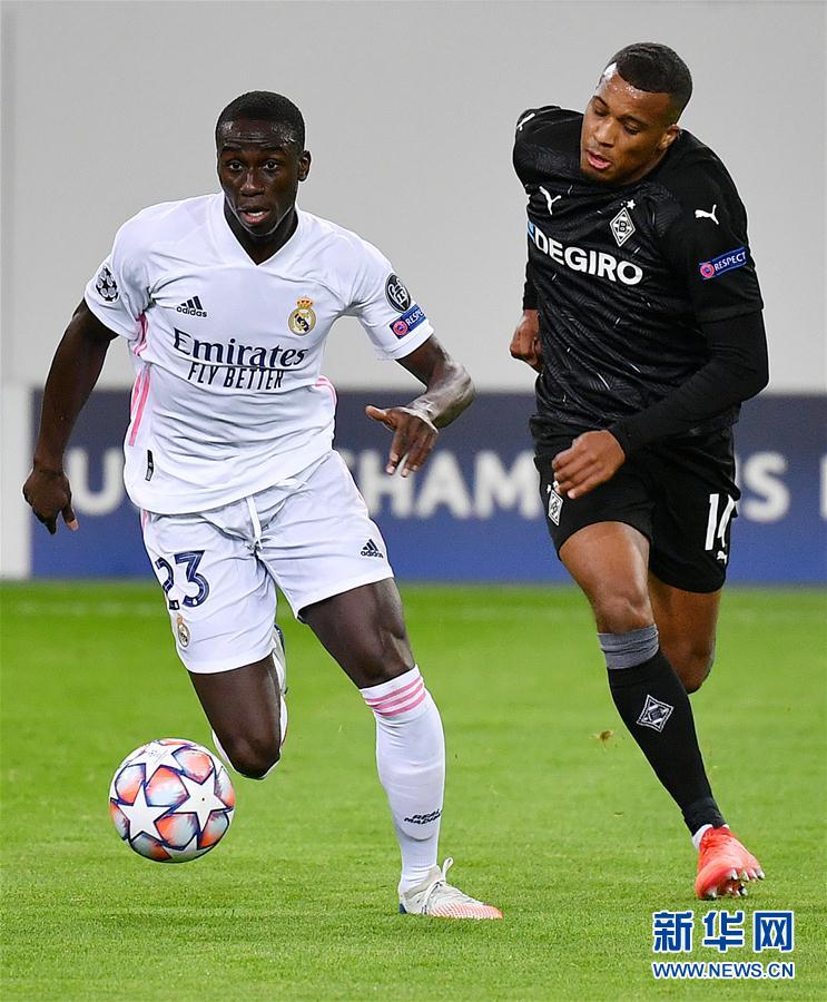 10月27日,皇家马德里队球员门迪(左)在比赛中与门兴格拉德巴赫队球员普莱亚拼抢。 当日,在2020-2021赛季欧足联冠军联赛小组赛B组第二轮的一场比赛中,西甲皇家马德里队客场以2比2战平德甲门兴格拉德巴赫队。 新华社发(乌尔里希·胡夫纳格尔摄)