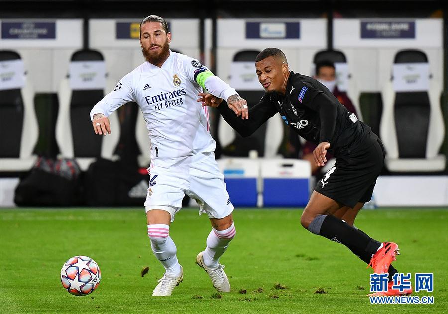 10月27日,皇家马德里队球员拉莫斯(左)在比赛中与门兴格拉德巴赫队球员普莱亚拼抢。 当日,在2020-2021赛季欧足联冠军联赛小组赛B组第二轮的一场比赛中,西甲皇家马德里队客场以2比2战平德甲门兴格拉德巴赫队。 新华社发(乌尔里希·胡夫纳格尔摄)
