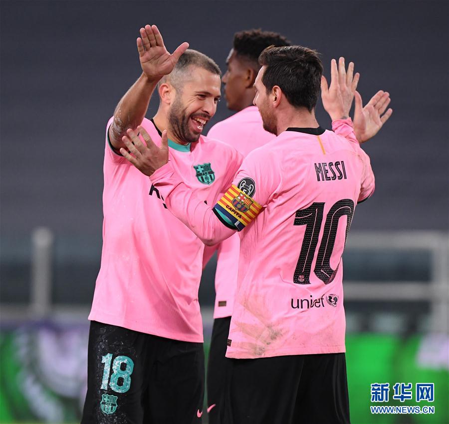 10月28日,巴塞罗那队球员梅西(前右)在进球后与队友阿尔巴庆祝。 当日,在2020-2021赛季欧足联冠军联赛小组赛G组第二轮的一场比赛中,西甲巴塞罗那队客场以2比0战胜意甲尤文图斯队。 新华社发(阿尔贝托·林格利亚摄)