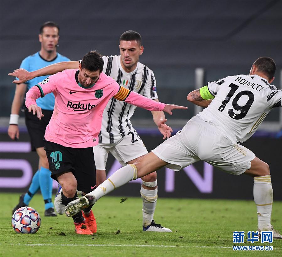 10月28日,尤文图斯队球员博努奇(右一)、德米拉尔(右二)在比赛中防守巴塞罗那队球员梅西。 当日,在2020-2021赛季欧足联冠军联赛小组赛G组第二轮的一场比赛中,西甲巴塞罗那队客场以2比0战胜意甲尤文图斯队。 新华社发(阿尔贝托·林格利亚摄)