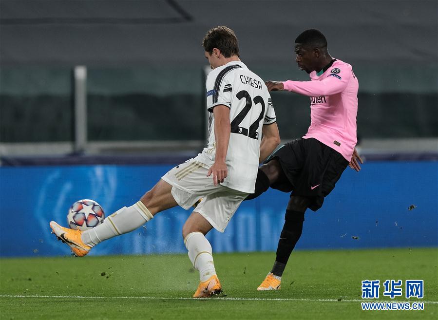 10月28日,巴塞罗那队球员登贝莱(右)在比赛中射门得分。 当日,在2020-2021赛季欧足联冠军联赛小组赛G组第二轮的一场比赛中,西甲巴塞罗那队客场以2比0战胜意甲尤文图斯队。 新华社发(阿尔贝托·林格利亚摄)