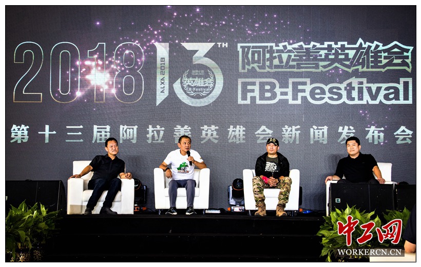 2018年8月18日,腾格里沙漠腹地的内蒙古阿拉善梦想公园,举行第十三届阿拉善英雄会新闻发布会。第13届越野e族·阿拉善英雄会将于10月2—5日在内蒙古自治区阿拉善盟再度起航。今年举行的越野e族·阿拉善英雄会将举办牧马人T1、T2攀爬赛、沙漠单车挑战赛,T3沙漠挑战赛、T3沙漠接力赛,沙漠UTV挑战赛等赛事,以及梦想之城音乐节、梦想国际美食节、房车生活展等系列活动。工人日报-中工网记者许之丰摄影报道