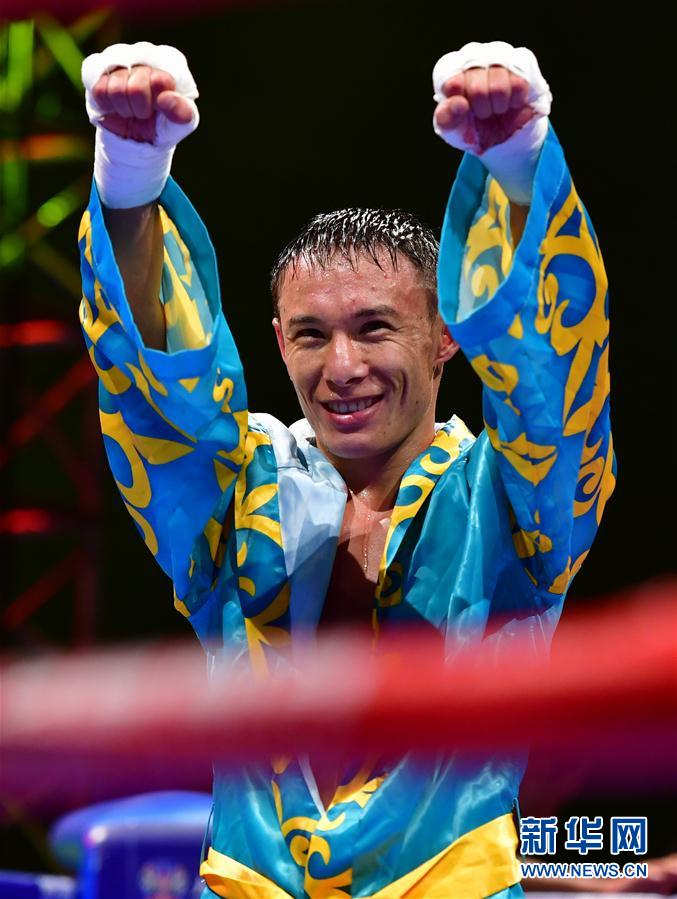 9月26日,哈萨克斯坦阿斯塔纳狼队选手特米尔塔斯在轻蝇量级比赛中以3比0战胜古巴驯兽师队选手达米安后庆祝。 新华社记者魏培全摄