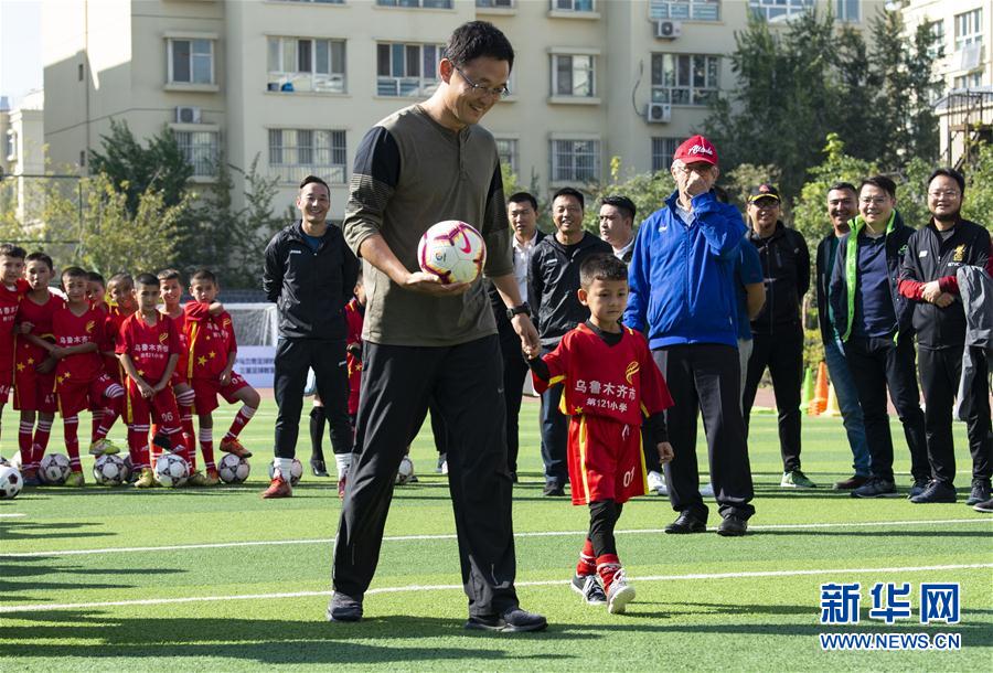 9月28日,前国足球员孙继海在乌鲁木齐市第121小学指导该校足球队训练。 新华社记者马锴摄