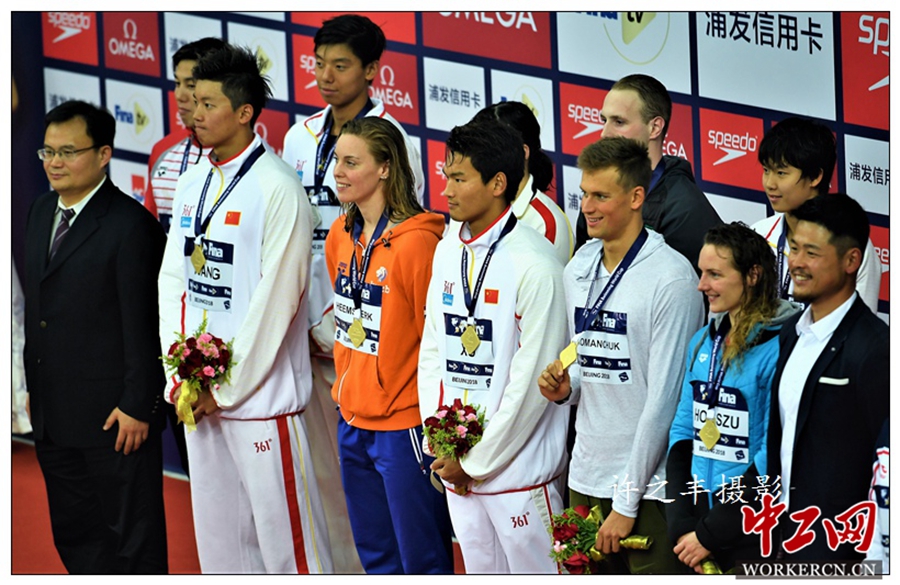 11月3日,2018年国际泳联短池游泳世界杯北京站比赛中,中国游泳领军人物徐嘉余表现出色,在男子50米仰泳决赛当中,以22秒70的成绩夺金,成为本站决赛唯一游进23秒的选手,并且徐嘉余的成绩还创造了全新的亚洲纪录,这是他本站赛事的第二块金牌。工人日报-中工网记者许之丰摄影报道