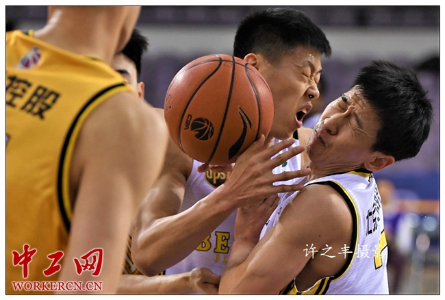 中工网讯 2019年1月8日晚,北京奥体中心篮球馆,CBA联赛第30轮比赛,北京农商行队主场以77比125负于广厦队,只有单外援出战的北京农商行队实力确实受到影响,输球48分也成为了本赛季比赛最大的分差纪录。图为双方的比赛瞬间。工人日报-中工网许之丰摄影报道