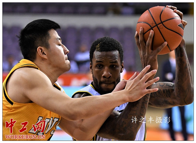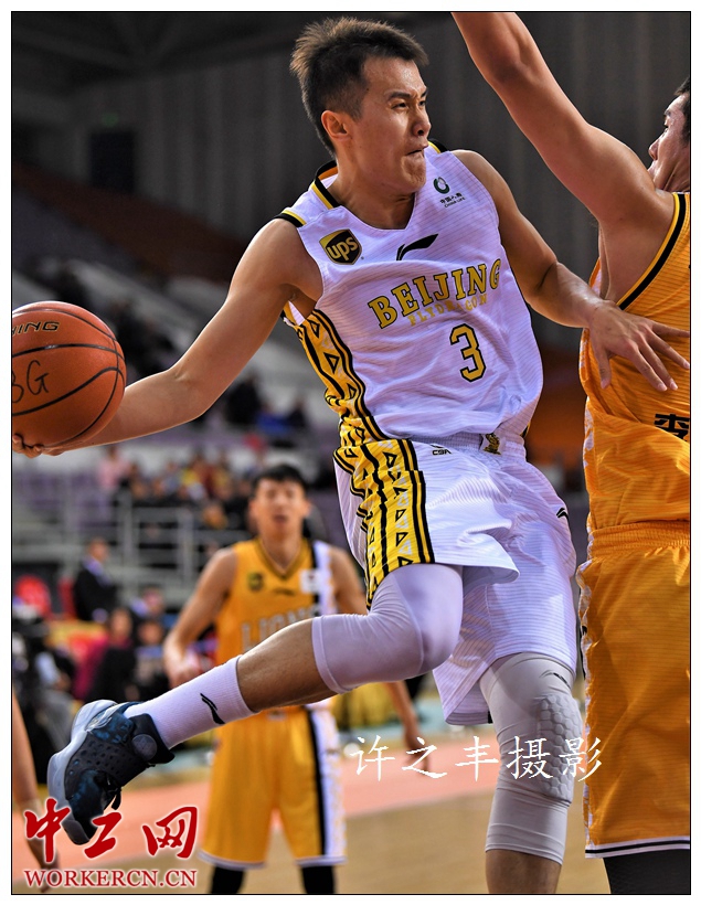 中工网讯 2019年1月8日晚,北京奥体中心篮球馆,CBA联赛第30轮比赛,北京农商行队主场以77比125负于广厦队,只有单外援出战的北京农商行队实力确实受到影响,输球48分也成为了本赛季比赛最大的分差纪录。图为双方的比赛瞬间。工人日报-中工网许之丰摄影报道