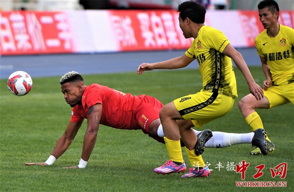 2019年3月31日,北京奥林匹克体育场,中甲联赛第3轮比赛,北京北体大队主场对阵呼和浩特队。上半场呼和浩特队由张天翔射门得分,随后外援桑格尔门前头球再入一球。下半场北京北体大队虽然加强了攻势,但仍然没能破门,最终北京北体大队主场0比2告负。比赛结束后北体大队主教练高洪波说“在我二十多年的执教生涯中,联赛开始前三轮球队不能取得进球,应该说是第一次。”图为双方的比赛。工人日报-中工网许之丰摄影报道