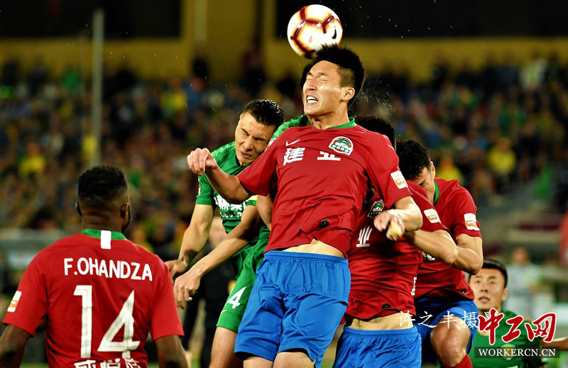 4月14日晚,2019赛季中超联赛第五轮比赛,北京中赫国安主场2比1战胜河南建业。比赛进行第52分钟,国安队进攻中建业后卫张文涛手球,主裁判在视频裁判提醒下判定点球,奥古斯托操刀命中。第68分钟,李可打入了归化球员在中超的首粒入球。第72分钟,建业队奥汉德扎点球破门。目前国安队取得开季5连胜独领积分榜首。图为双方的比赛瞬间。工人日报-中工网许之丰摄影报道