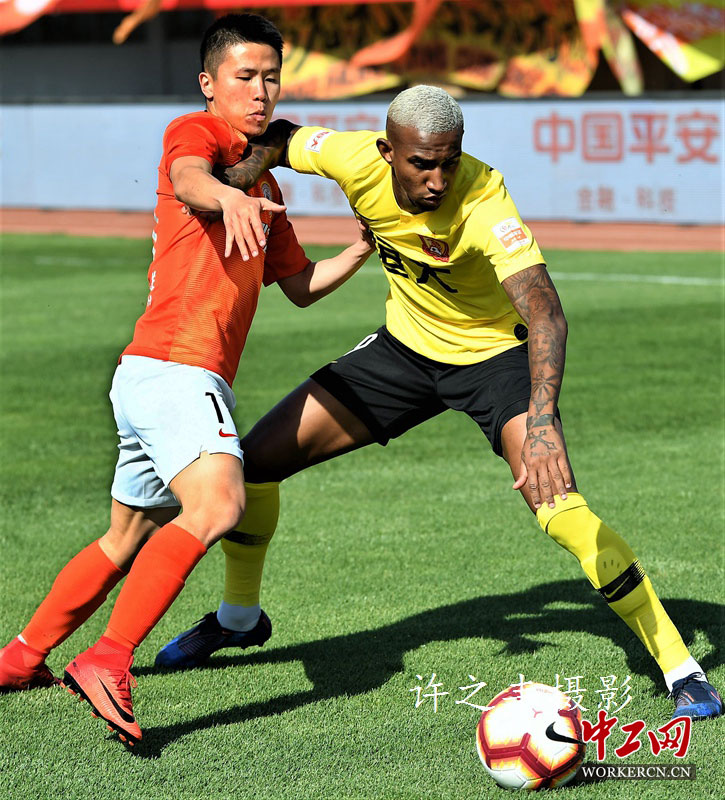 4月14日下午,2019赛季中超联赛第5轮比赛,北京人和主场2比1战胜广州恒大。比赛第27分钟,恒大队塔利斯卡任意球攻门击中立柱,杨立瑜头球补射破门。第45分钟,人和队迪奥普头球破门。全场补时阶段,人和队陈杰打入一球,绝杀恒大队。人和终止开季4连败,恒大4连胜被终结。图为双方的比赛瞬间。工人日报-中工网许之丰摄影报道