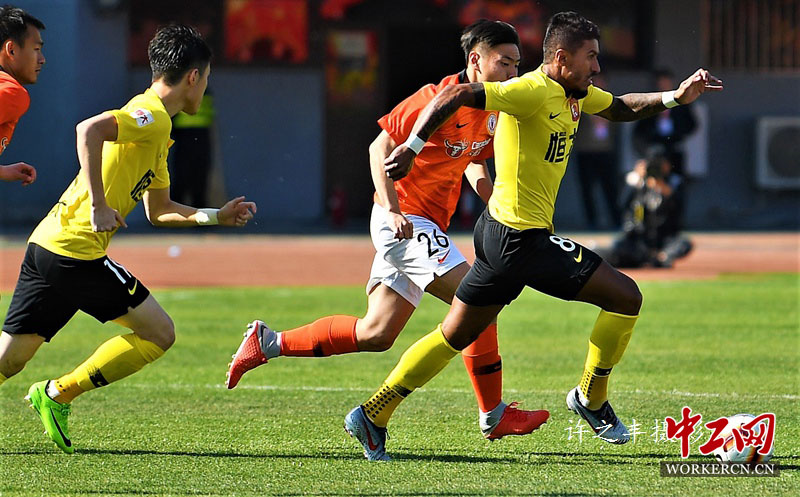 4月14日下午,2019赛季中超联赛第5轮比赛,北京人和主场2比1战胜广州恒大。比赛第27分钟,恒大队塔利斯卡任意球攻门击中立柱,杨立瑜头球补射破门。第45分钟,人和队迪奥普头球破门。全场补时阶段,人和队陈杰打入一球,绝杀恒大队。人和终止开季4连败,恒大4连胜被终结。图为双方的比赛瞬间。工人日报-中工网许之丰摄影报道