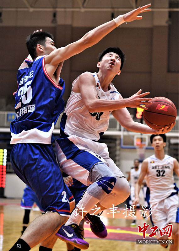 2019年6月7日晚,男篮NBL联赛第九轮,北京雄鹿队主场以127比122战胜河北翔蓝队。目前北京雄鹿队排名第九位,河北排名第十一位。北京队杨赢得35分,菲尔德35分,李梓铭19分,虞恒14分。河北队海耶斯赢得47分,董梦超27分,谷晨旭10分。图为双方比赛瞬间。工人日报-中工网许之丰摄影报道