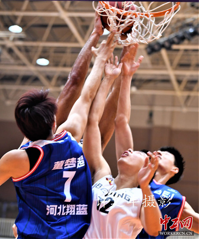 2019年6月7日晚,男篮NBL联赛第九轮,北京雄鹿队主场以127比122战胜河北翔蓝队。目前北京雄鹿队排名第九位,河北排名第十一位。北京队杨赢得35分,菲尔德35分,李梓铭19分,虞恒14分。河北队海耶斯赢得47分,董梦超27分,谷晨旭10分。图为双方比赛瞬间。工人日报-中工网许之丰摄影报道