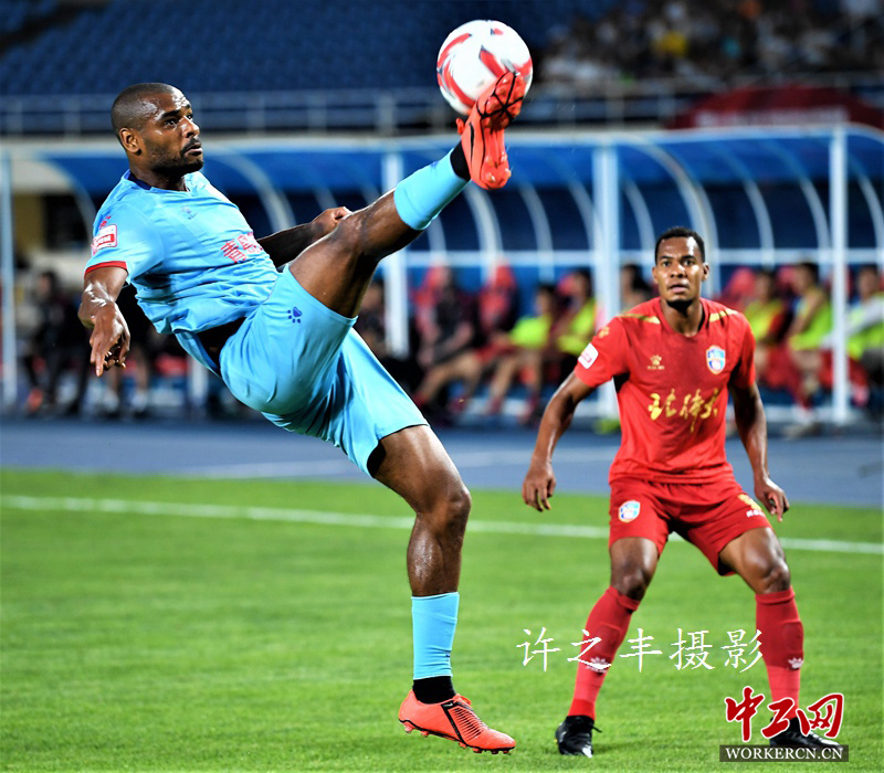 2019年6月15日晚,中甲联赛第13轮比赛,北京北体大队主场迎战领头羊青岛黄海队。比赛开始第3分钟,青岛队王栋利用任意球率先得分。第30分钟,北体大队林斯远射将比分扳平。第58分钟,北体大队戈武禁区内劲射反超比分。第83分钟,北体大队王建文再下入一球。最终北京北体大队主场以3比1击败中甲领头羊青岛黄海队。图为双方的比赛瞬间。工人日报-中工网许之丰摄影报道