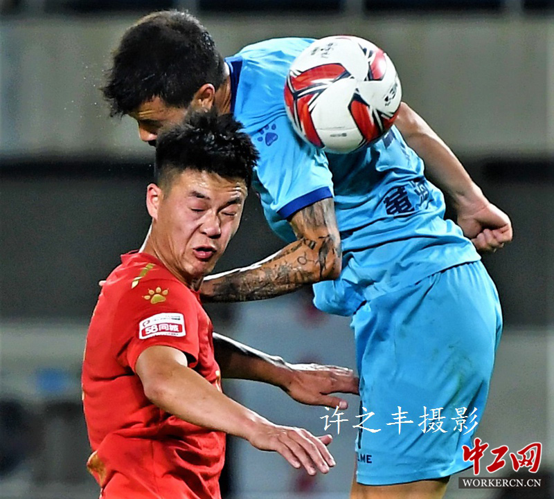 2019年6月15日晚,中甲联赛第13轮比赛,北京北体大队主场迎战领头羊青岛黄海队。比赛开始第3分钟,青岛队王栋利用任意球率先得分。第30分钟,北体大队林斯远射将比分扳平。第58分钟,北体大队戈武禁区内劲射反超比分。第83分钟,北体大队王建文再下入一球。最终北京北体大队主场以3比1击败中甲领头羊青岛黄海队。图为双方的比赛瞬间。工人日报-中工网许之丰摄影报道