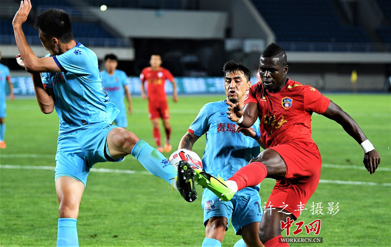 2019年6月15日晚,中甲联赛第13轮比赛,北京北体大队主场迎战领头羊青岛黄海队。比赛开始第3分钟,青岛队王栋利用任意球率先得分。第30分钟,北体大队林斯远射将比分扳平。第58分钟,北体大队戈武禁区内劲射反超比分。第83分钟,北体大队王建文再下入一球。最终北京北体大队主场以3比1击败中甲领头羊青岛黄海队。图为双方的比赛瞬间。工人日报-中工网许之丰摄影报道