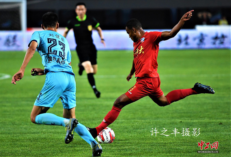 2019年6月15日晚,中甲联赛第13轮比赛,北京北体大队主场迎战领头羊青岛黄海队。比赛开始第3分钟,青岛队王栋利用任意球率先得分。第30分钟,北体大队林斯远射将比分扳平。第58分钟,北体大队戈武禁区内劲射反超比分。第83分钟,北体大队王建文再下入一球。最终北京北体大队主场以3比1击败中甲领头羊青岛黄海队。图为双方的比赛瞬间。工人日报-中工网许之丰摄影报道