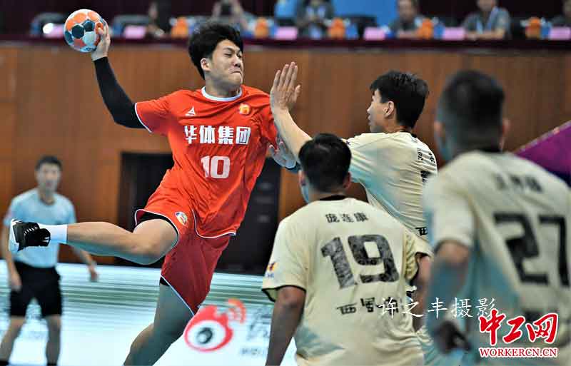 2019年6月28日晚,2019中国男子手球超级联赛在北京光彩体育馆打响,在揭幕战中,华体国家男子手球俱乐部以33比26战胜太平洋保险江苏男子手球俱乐部。华体集团成为了中国国家男子手球俱乐部的冠名赞助商。中国华体队王军程与江苏队赵楠一同当选本场比赛的MVP球员。图为双方的比赛瞬间。工人日报-中工网许之丰摄影报道