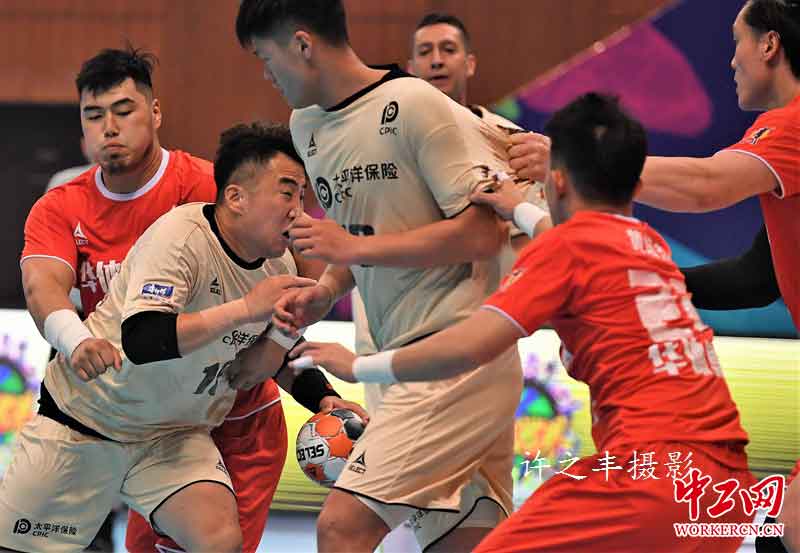 2019年6月28日晚,2019中国男子手球超级联赛在北京光彩体育馆打响,在揭幕战中,华体国家男子手球俱乐部以33比26战胜太平洋保险江苏男子手球俱乐部。华体集团成为了中国国家男子手球俱乐部的冠名赞助商。中国华体队王军程与江苏队赵楠一同当选本场比赛的MVP球员。图为双方的比赛瞬间。工人日报-中工网许之丰摄影报道