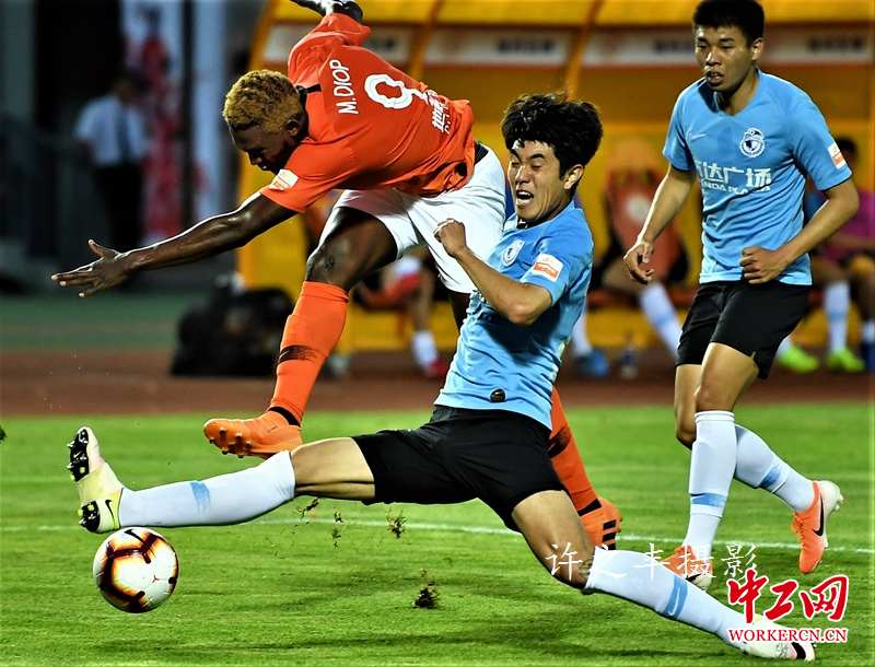 2019年6月29日晚,中超联赛第15轮比赛,北京人和坐镇丰台体育中心迎战大连一方。比赛第2分钟,人和队迪奥普接阿卢科任意球传中头球攻入一球,下半时风云突变,客队一方博阿滕造点球卡拉斯科主罚一方扳平比分,哈姆西克推射逆转比分,博阿滕利用张烈出击失误将球送入空门,大连一方在8分钟内连入三球。最终北京人和主场以1比3负于大连一方。图为双方的比赛瞬间。工人日报-中工网许之丰摄影报道