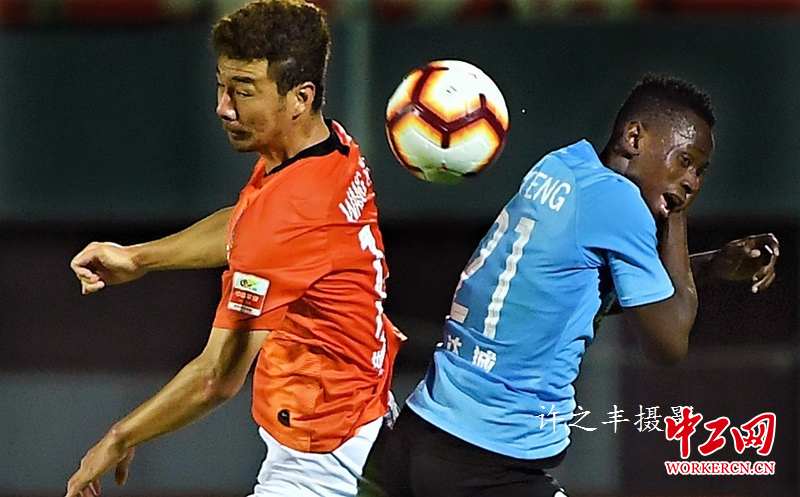 2019年6月29日晚,中超联赛第15轮比赛,北京人和坐镇丰台体育中心迎战大连一方。比赛第2分钟,人和队迪奥普接阿卢科任意球传中头球攻入一球,下半时风云突变,客队一方博阿滕造点球卡拉斯科主罚一方扳平比分,哈姆西克推射逆转比分,博阿滕利用张烈出击失误将球送入空门,大连一方在8分钟内连入三球。最终北京人和主场以1比3负于大连一方。图为双方的比赛瞬间。工人日报-中工网许之丰摄影报道