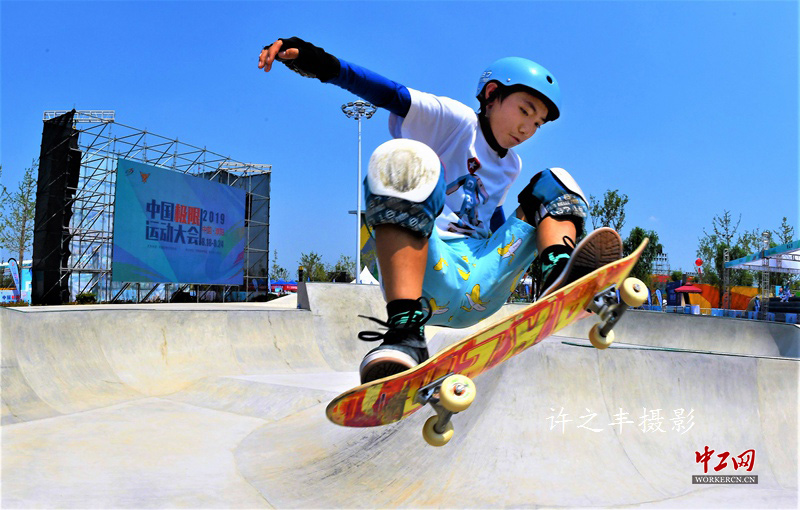 2019年8月19日,中国极限运动会进行第二天的比赛,碗池滑板决赛在河南省濮阳市清丰县展开角逐。滑板碗池运动是上世纪80年代末90年代初开始进入中国,自2016年滑板项目纳入奥林匹克运动会后,关注滑板运动的人群成倍增长。滑板运动青春时尚,空中飞跃,碾磨和滑行,跨越不同高度的弯道,个性化自由发挥,深受青少年喜爱。图为中国极限运动会滑板碗池决赛。工人日报-中工网许之丰摄影报道