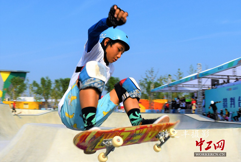 2019年8月19日,中国极限运动会进行第二天的比赛,碗池滑板决赛在河南省濮阳市清丰县展开角逐。滑板碗池运动是上世纪80年代末90年代初开始进入中国,自2016年滑板项目纳入奥林匹克运动会后,关注滑板运动的人群成倍增长。滑板运动青春时尚,空中飞跃,碾磨和滑行,跨越不同高度的弯道,个性化自由发挥,深受青少年喜爱。图为中国极限运动会滑板碗池决赛。工人日报-中工网许之丰摄影报道