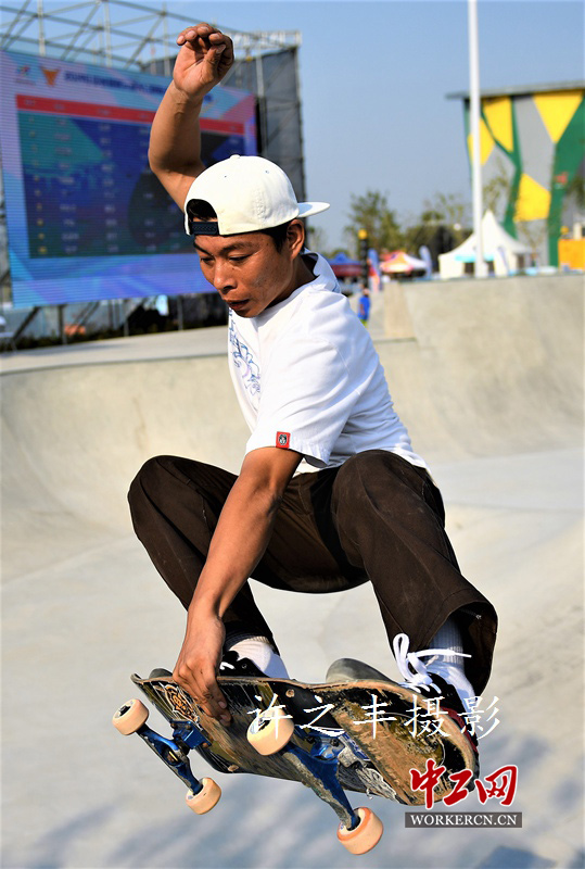 2019年8月19日,中国极限运动会进行第二天的比赛,碗池滑板决赛在河南省濮阳市清丰县展开角逐。滑板碗池运动是上世纪80年代末90年代初开始进入中国,自2016年滑板项目纳入奥林匹克运动会后,关注滑板运动的人群成倍增长。滑板运动青春时尚,空中飞跃,碾磨和滑行,跨越不同高度的弯道,个性化自由发挥,深受青少年喜爱。图为中国极限运动会滑板碗池决赛。工人日报-中工网许之丰摄影报道