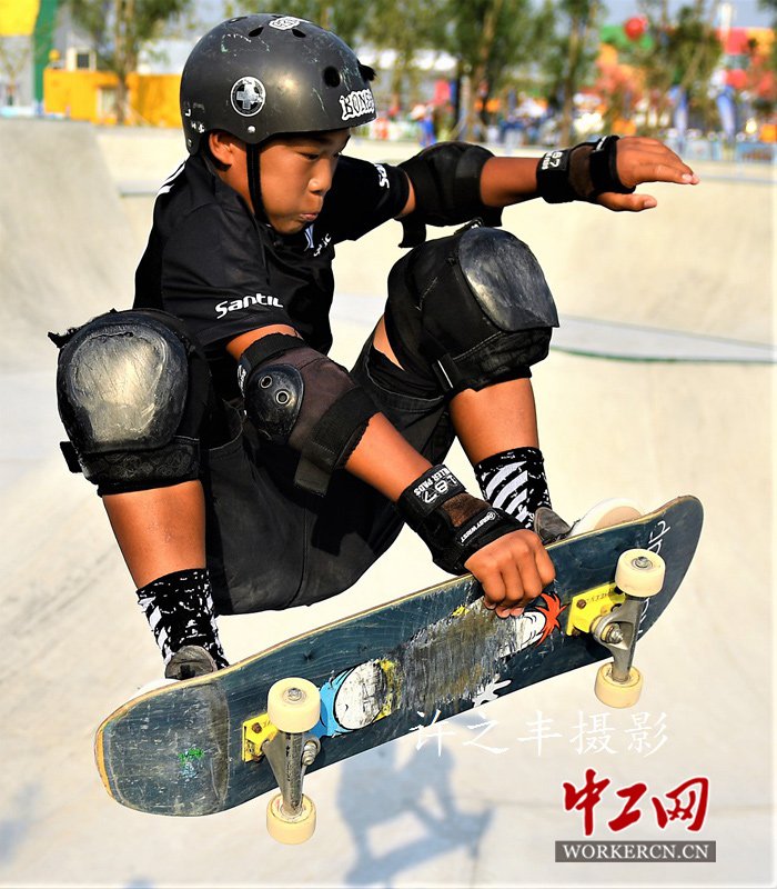 2019年8月19日,中国极限运动会进行第二天的比赛,碗池滑板决赛在河南省濮阳市清丰县展开角逐。滑板碗池运动是上世纪80年代末90年代初开始进入中国,自2016年滑板项目纳入奥林匹克运动会后,关注滑板运动的人群成倍增长。滑板运动青春时尚,空中飞跃,碾磨和滑行,跨越不同高度的弯道,个性化自由发挥,深受青少年喜爱。图为中国极限运动会滑板碗池决赛。工人日报-中工网许之丰摄影报道