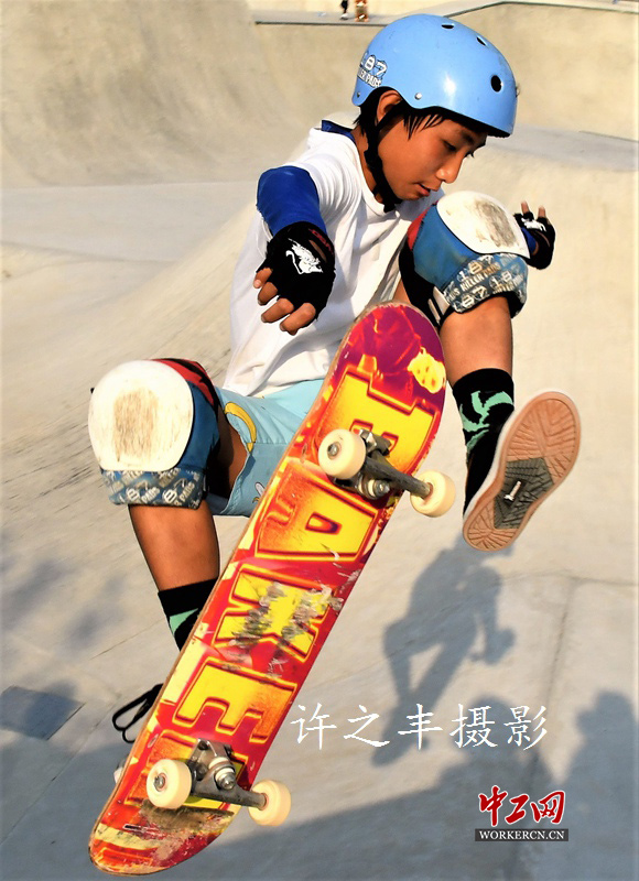 2019年8月19日,中国极限运动会进行第二天的比赛,碗池滑板决赛在河南省濮阳市清丰县展开角逐。滑板碗池运动是上世纪80年代末90年代初开始进入中国,自2016年滑板项目纳入奥林匹克运动会后,关注滑板运动的人群成倍增长。滑板运动青春时尚,空中飞跃,碾磨和滑行,跨越不同高度的弯道,个性化自由发挥,深受青少年喜爱。图为中国极限运动会滑板碗池决赛。工人日报-中工网许之丰摄影报道