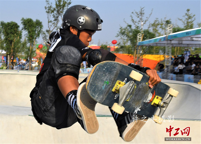 2019年8月19日,中国极限运动会进行第二天的比赛,碗池滑板决赛在河南省濮阳市清丰县展开角逐。滑板碗池运动是上世纪80年代末90年代初开始进入中国,自2016年滑板项目纳入奥林匹克运动会后,关注滑板运动的人群成倍增长。滑板运动青春时尚,空中飞跃,碾磨和滑行,跨越不同高度的弯道,个性化自由发挥,深受青少年喜爱。图为中国极限运动会滑板碗池决赛。工人日报-中工网许之丰摄影报道