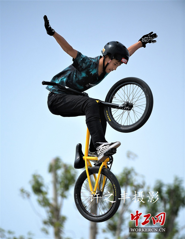 2019年8月20日,在河南濮阳进行的中国极限运动大会上进行的小轮车比赛。小轮车已经成为了奥运会正式比赛项目。BMX小轮车分为街道花式小轮车、泥地竞速、和攀爬车竞技。小轮车的特技表演需要一定的难度,要有较好的技术和平衡能力。图为极限运动大会小轮车在U型池里进行跳跃花式比赛。工人日报-中工网许之丰摄影报道