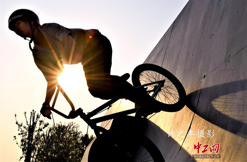 2019年8月20日,在河南濮阳进行的中国极限运动大会上进行的小轮车比赛。小轮车已经成为了奥运会正式比赛项目。BMX小轮车分为街道花式小轮车、泥地竞速、和攀爬车竞技。小轮车的特技表演需要一定的难度,要有较好的技术和平衡能力。图为极限运动大会小轮车在U型池里进行跳跃花式比赛。工人日报-中工网许之丰摄影报道
