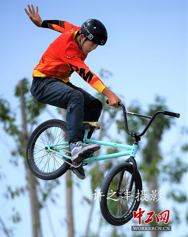 2019年8月20日,在河南濮阳进行的中国极限运动大会上进行的小轮车比赛。小轮车已经成为了奥运会正式比赛项目。BMX小轮车分为街道花式小轮车、泥地竞速、和攀爬车竞技。小轮车的特技表演需要一定的难度,要有较好的技术和平衡能力。图为极限运动大会小轮车在U型池里进行跳跃花式比赛。工人日报-中工网许之丰摄影报道