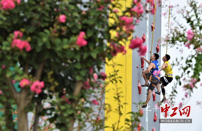 2019年8月21日,2019年中国极限运动大会攀岩速度比赛在河南濮阳清丰运动基地举行。攀岩运动由登山运动衍生而来,富有很强的技巧性和冒险性,在世界上十分流行。在中国经过十多年,特别是近两年的发展已初具规模,并吸引了越来越多的年轻人参加。2019年中国极限运动大会攀岩速度系列赛分为大众组和专业组两个组别。图为8月21日中国极限运动大会攀岩速度比赛。工人日报-中工网许之丰摄影报道