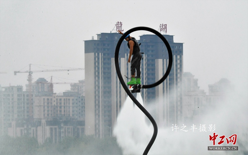 河南濮阳(又称龙城),被称之为“中华龙乡”。 2019年8月22日,中国极限运动大会摩托艇比赛在濮阳龙湖进行。摩托艇水上飞人比赛,运动员在空中上演惊险和刺激的飞行动作,在龙城这座新兴城市上空留下了精彩的瞬间。工人日报-中工网许之丰摄影报道