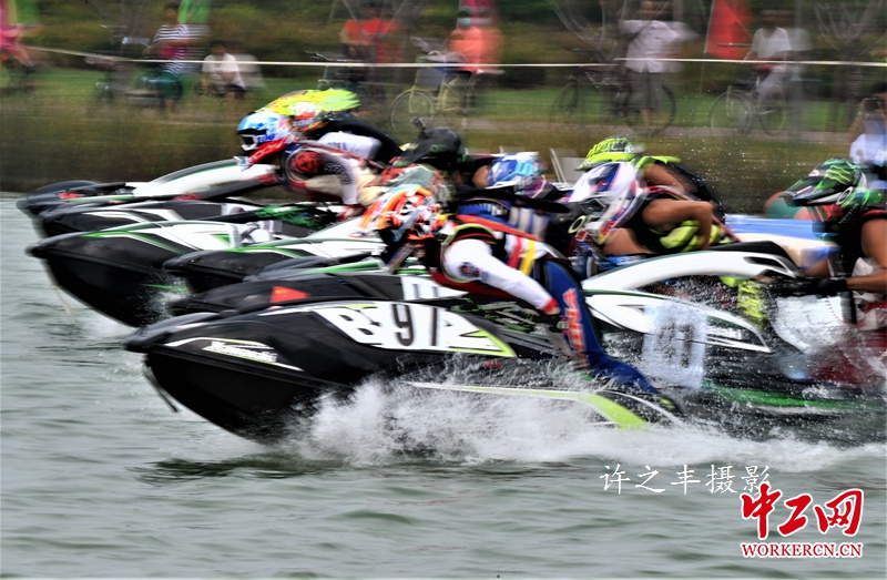 中工网讯 摩托艇运动是集高科技、观赏、竞争和惊险刺激于一体的高速水上运动。竞技类的摩托艇时速可以达到每小时170公里。图为2019中国极限运动大会上进行的坐式水上摩托竞速赛和立式水上摩托障碍回旋对抗赛。工人日报-中工网许之丰摄影报道