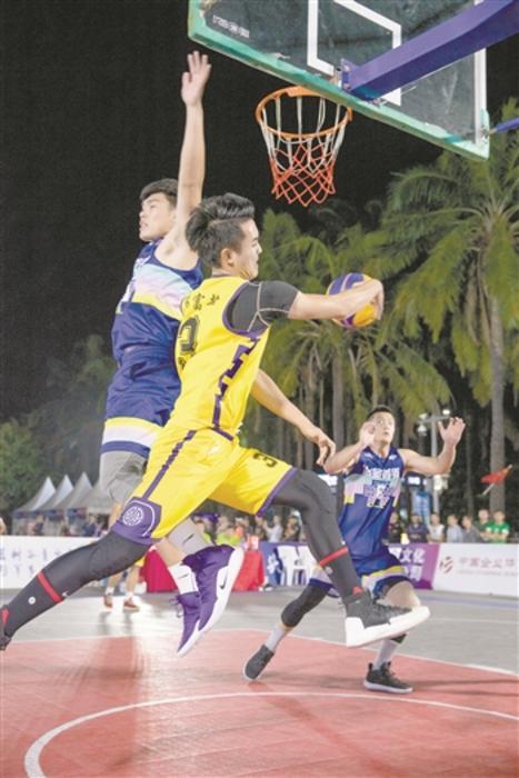 11月30日,3x3篮球比赛现场,冶金首钢队和三亚职工队正在比赛中拼抢。