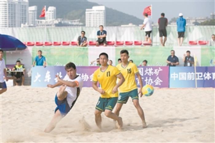 11月28日,广东前卫队和火车头体育协会队的沙滩足球比赛在三亚大东海举行。该项比赛攻防转换快,战术相对简单。本组照片由工人日报-中工网记者王伟伟摄