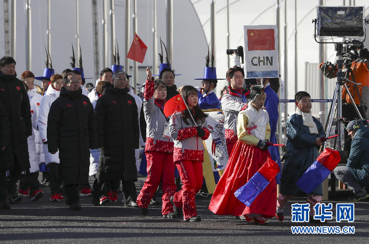 韩国仪仗队先行入场列队欢迎,随后中国体育代表团身着白色羽绒服在音乐伴奏下步入升旗广场。