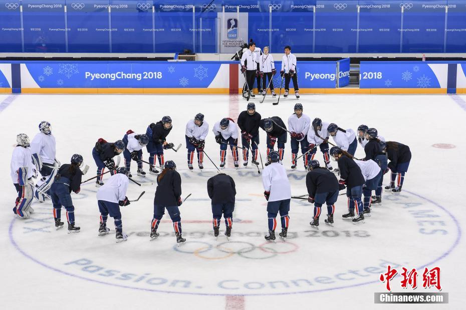 2月7日,2018平昌冬奥会开幕在即,朝韩女子冰球联队下午在位于韩国江原道江陵市的关东冰球中心进行训练。此次为双方首次在奥运会级别的国际综合体育赛事上组建联队。图为朝韩联队运动员在结束训练后互相勉励。中新社记者 崔楠 摄