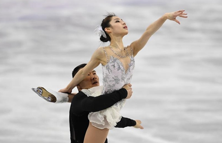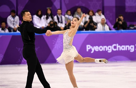 ↑2月9日,中国选手巴德鑫和王芮(左)在比赛中。新华社记者马平摄