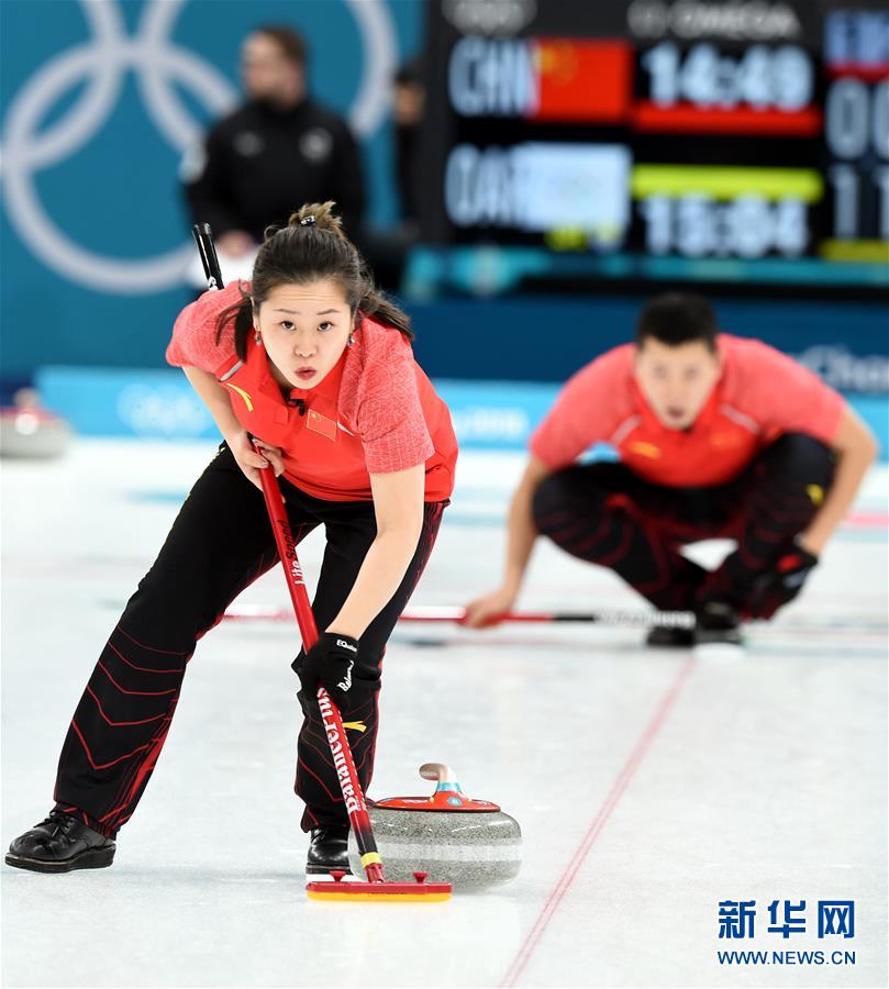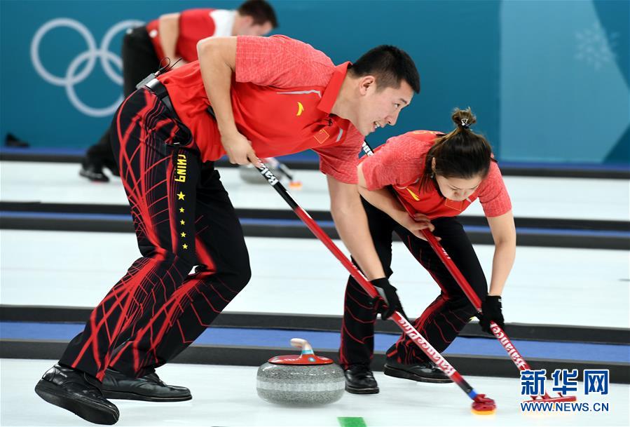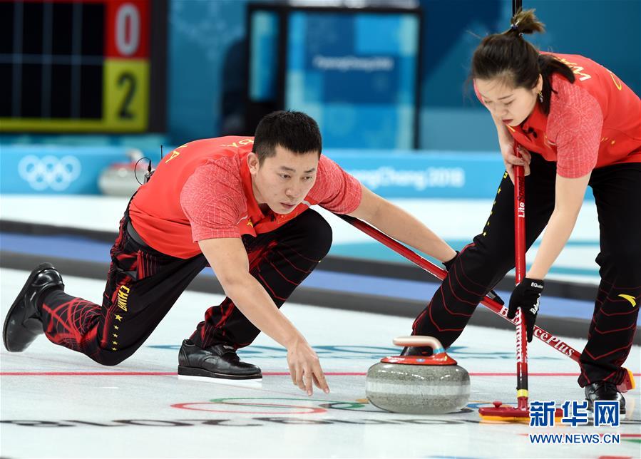↑2月9日,中国选手巴德鑫(右)和王芮在比赛中。当日,在韩国江陵冰壶中心举行的2018年平昌冬奥会冰壶项目混双循环赛中,中国混双选手巴德鑫和王芮以5比6负于俄罗斯奥林匹克选手阿纳斯塔西娅和亚历山大。新华社记者马平摄