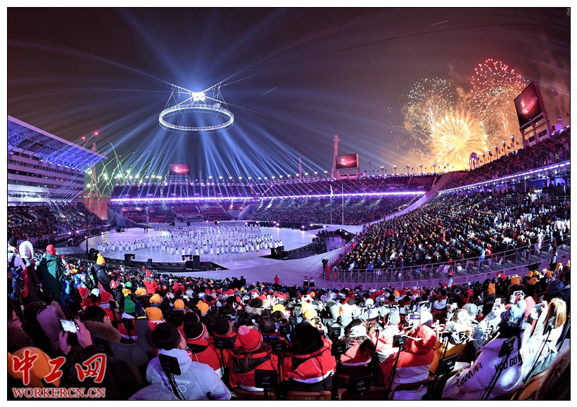 2018年2月9日晚,平昌冬奥会开幕式在韩国平昌奥林匹克体育场举行。来自全球92个国家和地区的2900余名运动员将本届冬奥会。开幕式以“和平”为主题,表达了对和平的向往。在成功举办1988年汉城夏季奥运会的30年后,韩国人用两个多小时的平昌冬奥会开幕式向世界传递奥运精神。引人注目的朝韩代表团携手入场。工人日报-中工网特派记者许之丰摄影报道