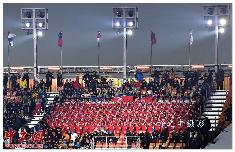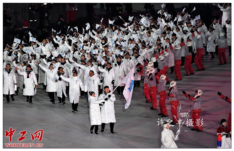 2018年2月9日晚,平昌冬奥会开幕式在韩国平昌奥林匹克体育场举行。来自全球92个国家和地区的2900余名运动员将本届冬奥会。开幕式以“和平”为主题,表达了对和平的向往。在成功举办1988年汉城夏季奥运会的30年后,韩国人用两个多小时的平昌冬奥会开幕式向世界传递奥运精神。引人注目的朝韩代表团携手入场。工人日报-中工网特派记者许之丰摄影报道